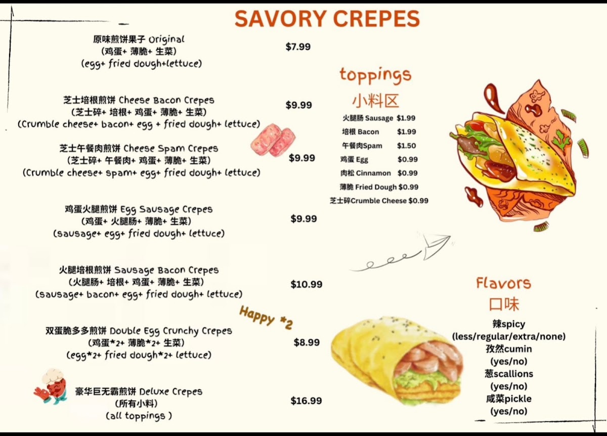 egg+ crunchy filling +lettuce (What is Chinese Savory crepes It’s called “Jian Bing Guo Zi” in Chinese, ‘Jian Bing “is like savory crepes ,two eggs are cracked on the top, and the other side is brushed with sauces. Jian bings have crunchy filling of fried dough and some scallions.Jian bings are the best grab and go street food .)