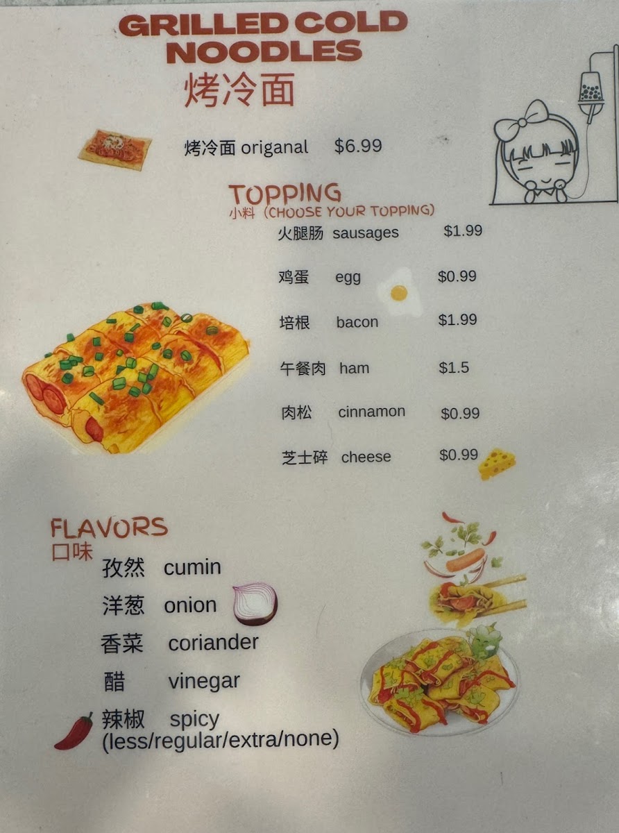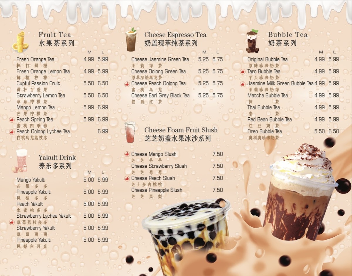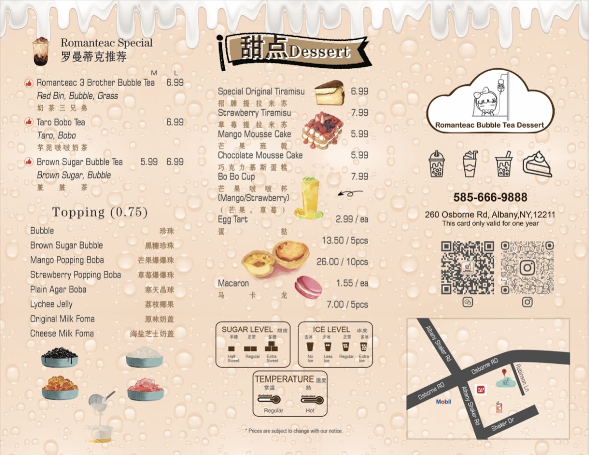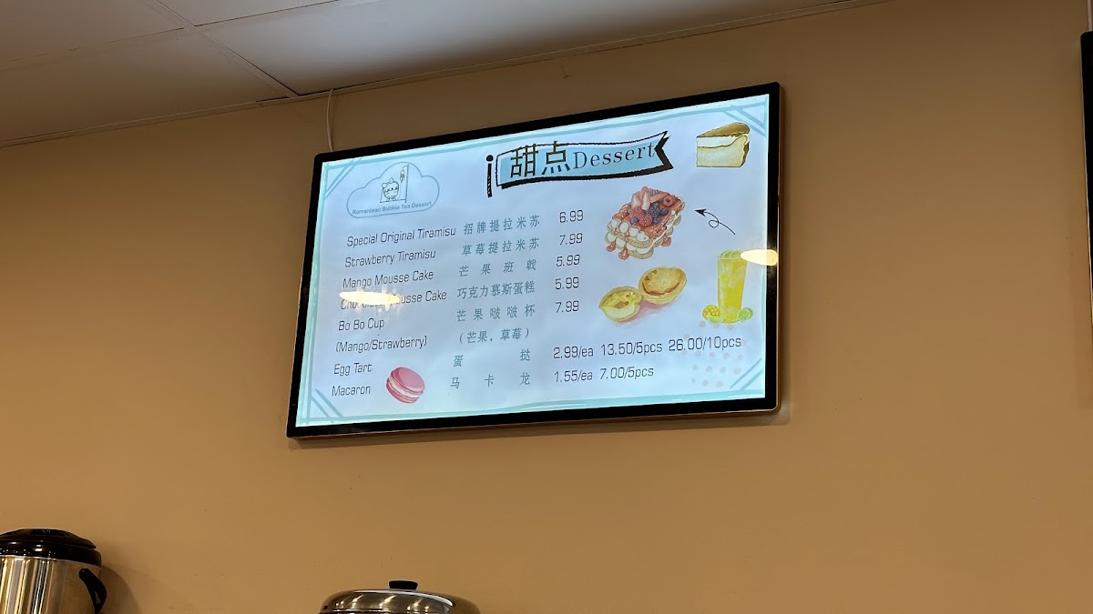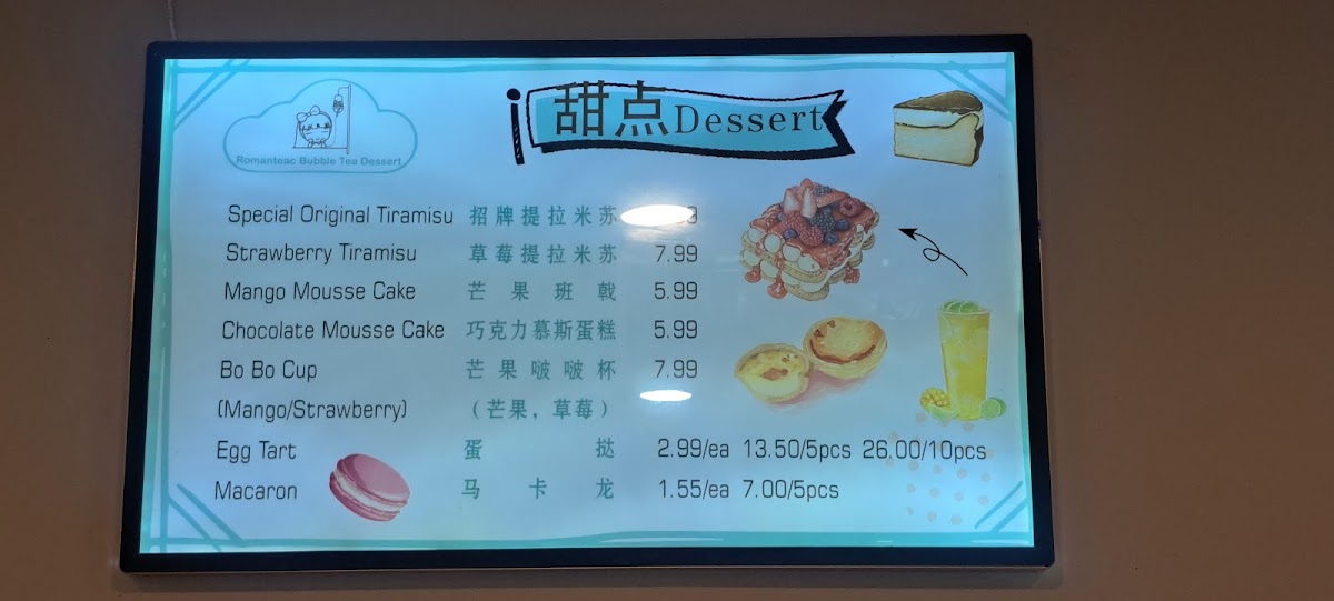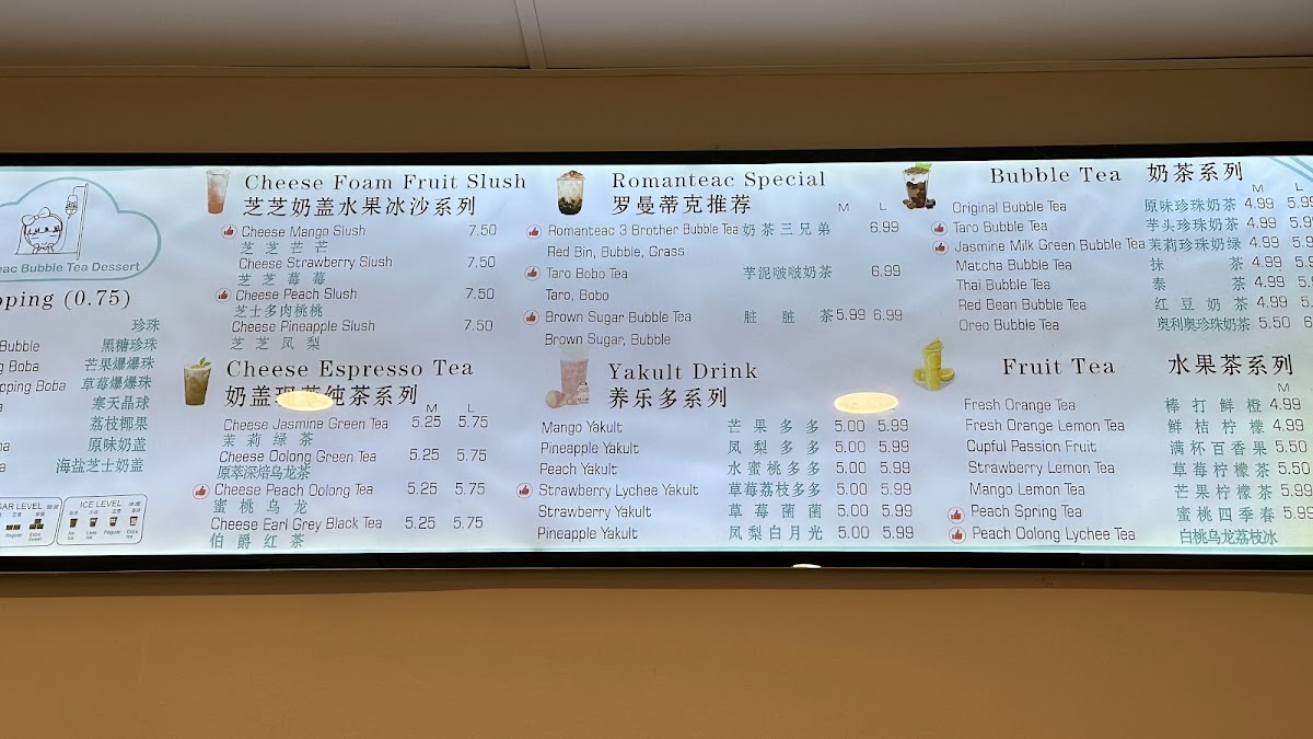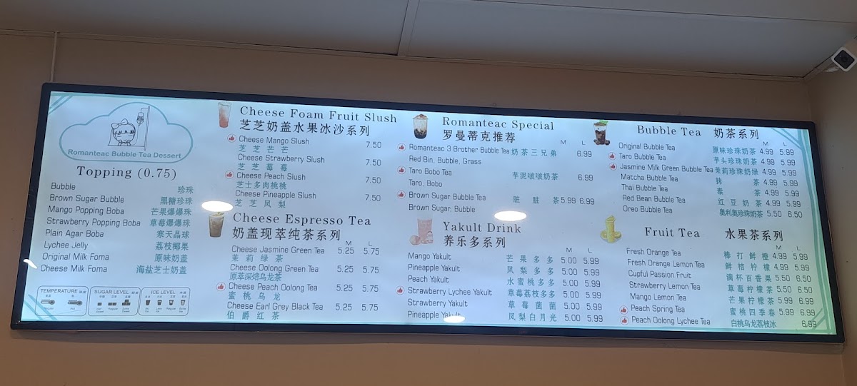 The menu at Romanteac Bubble Tea Dessert offers an exciting variety of refreshing beverages and savory delights. For fruit slush enthusiasts, there are options like Cheese Strawberry Slush and Cheese Mango Slush. The fruit tea selection includes choices like Fresh Orange Lemon Tea and Mango Lemon Tea, perfect for a tangy sip. If you're craving something more substantial, their grilled cold noodles, including 卫龙辣条 and Taiwan Grilled Sausage (台湾烤肠), are great for those looking to indulge in something savory. For a special treat, the Romanteac Special section features options like Mango Pomelo Sago and Brown Sugar Bubble Tea, offering a fusion of flavors. Sweet cravings are satisfied with desserts such as the Mocha Mousse Cake and Egg Tart (1pc). Of course, no visit would be complete without trying one of their bubble teas, such as the Red Bean Bubble Tea or the indulgent Osmanthus Oolong Milk Tea. Savory fans can enjoy delicious crepes, with choices like the Sausage Bacon Crepes and Egg Sausage Crepes. For a probiotic twist, try the Mango Yakult or Strawberry Lychee Yakult from their Yakult drink selection. And, to top it off, the Cheese Jasmine Green Tea and Cheese Earl Grey Black Tea bring a rich, creamy addition to their drink options. Whether you're in the mood for something sweet, savory, or refreshing, Romanteac's menu has something to please every palate.